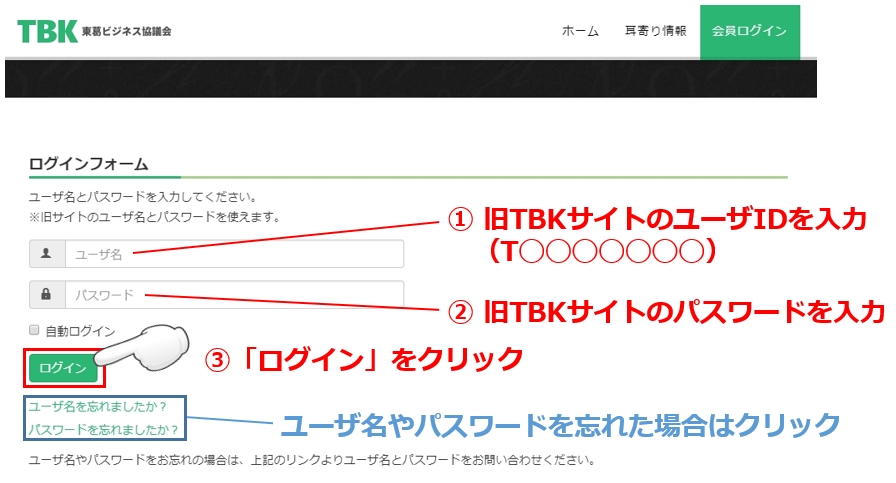 旧TBKサイトのユーザID(T◯◯◯◯◯◯◯)とパスワードをそのまま使えます。