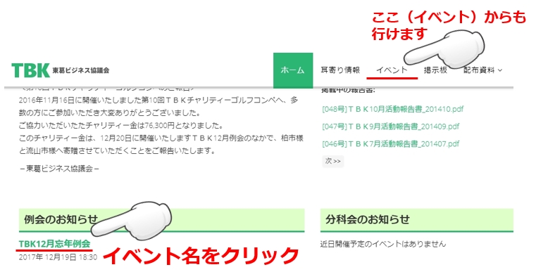 また、上部メニューの「イベント」からは例会/分科会等の一覧ページが見られます。一覧ページから個別の例会、分科会のページに進むことも可能です。
