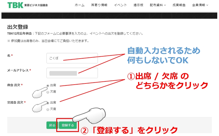 出欠登録は、例会および交流会の出欠を選んで「登録する」ボタンを押すだけでOKです。