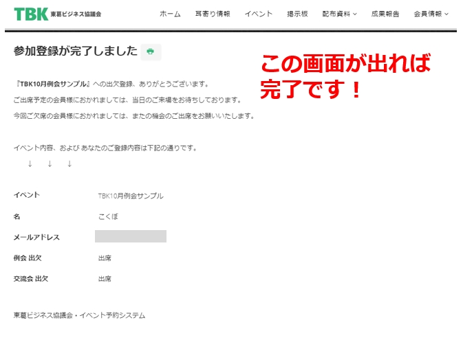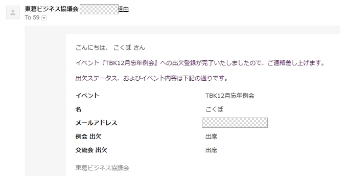 また、出欠登録完了時にはシステムから登録完了をお知らせするメールが届きます。